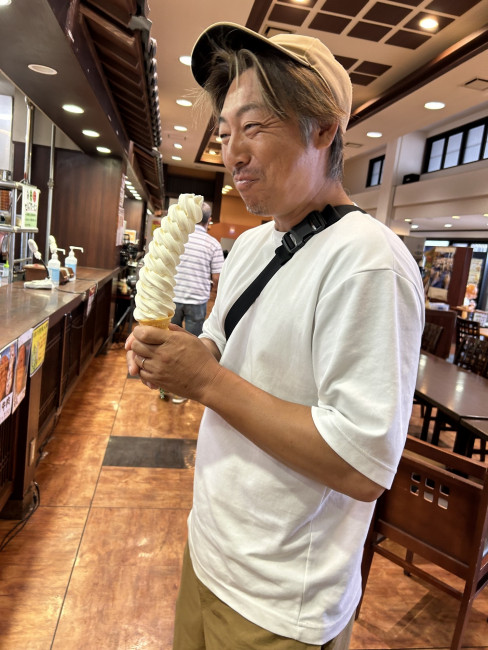 ソフトクリームでかいし、すぐ溶けるから食べるの大変でしたがおじさんは嬉しそうでした。